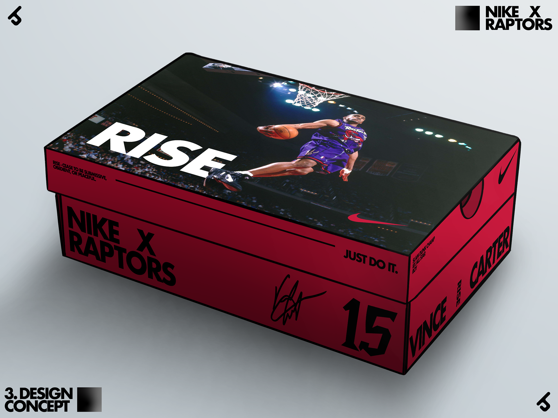Design Process: Concept three takes inspiration from existing Nike posters and ads to give the viewer a sense of wonder. Vince Carter is shown “Rising” as the focus of this box, while the red portions display additional complementary information. The idea was to make the viewer excited to wear Nike shoes and support the Raptors.